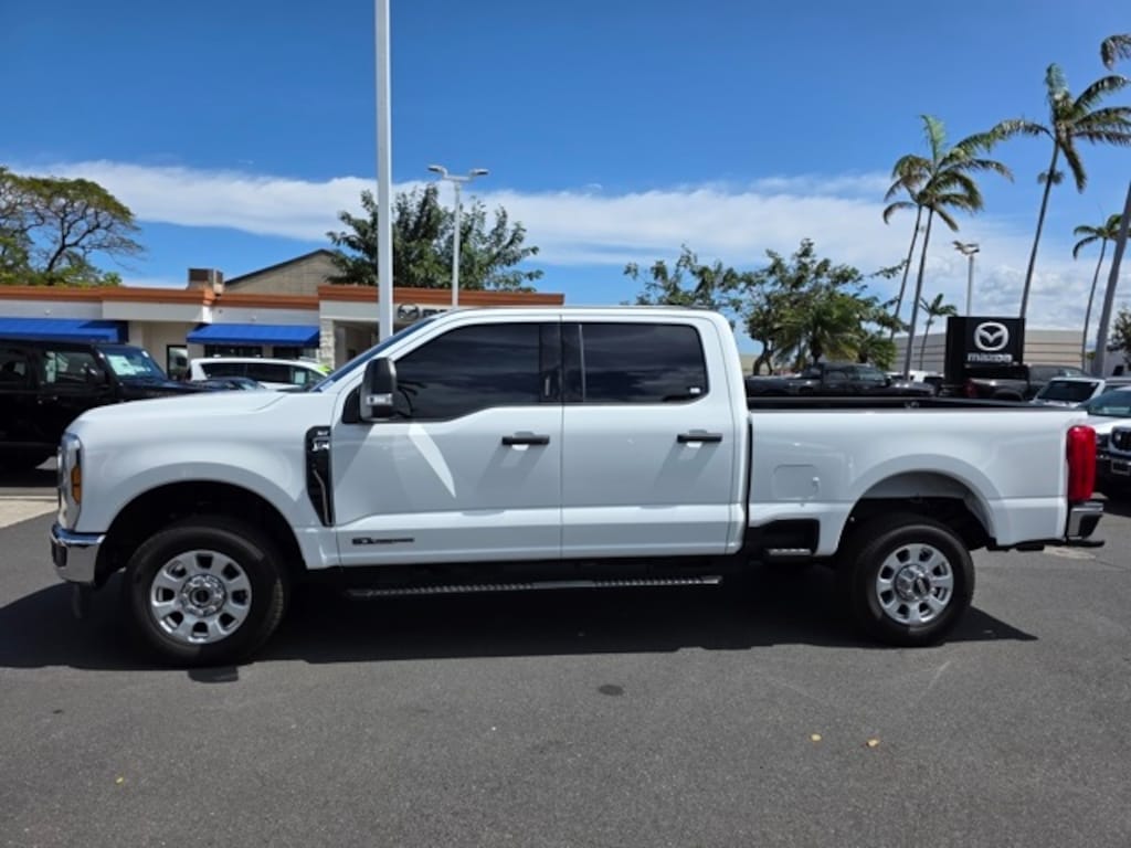 This Ford F-350SD has many features and is well equipped including Order Code 613A, 4WD, 190 Amp Alternator, 4-Wheel Disc Brakes, 6 Speakers, ABS brakes, Air Conditioning, All-Weather Floor Mats, Alloy wheels, AM/FM radio, AM/FM Stereo w/MP3 Player, Auto High-beam Headlights, Brake assist, Bumpers: chrome, Cloth 40/20/40 Split Bench Seat, Compass, Delay-off headlights, Driver door bin, Driver vanity mirror, Dual 68 AH/65 AGM Batteries, Dual front impact airbags, Dual front side impact airbags, Electronic Stability Control, Electronic-Locking w/3.31 Axle Ratio, Electronic-Locking w/3.73 Axle Ratio, Emergency communication system: SYNC 4 911 Assist, Exterior Parking Camera Rear, Front anti-roll bar, Front Center Armrest w/Storage, Front fog lights, Front License Plate Bracket, Front reading lights, Fully automatic headlights, Heated door mirrors, Illuminated entry, Low tire pressure warning, Outside temperature display, Overhead airbag, Overhead console, Panic alarm, Passenger door bin, Passenger vanity mirror, Platform Running Boards, Power door mirrors, Power driver seat, Power steering, Power windows, Privacy Glass, Rear reading lights, Rear step bumper, Remote keyless entry, Speed control, Split folding rear seat, Steering wheel mounted audio controls, SYNC 4, Tachometer, Telescoping steering wheel, Tilt steering wheel, Tough Bed Spray-In Bedliner, Traction control, Trip computer, Turn signal indicator mirrors, Variably intermittent wipers, and Wheels: 18" Sparkle Silver Painted Cast Aluminum. Oxford White 2024 Ford F-350SD XLT 4WD 10-Speed Automatic Power Stroke 6.7L V8 DI 32V OHV Turbodiesel 4WD.