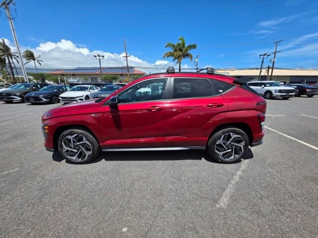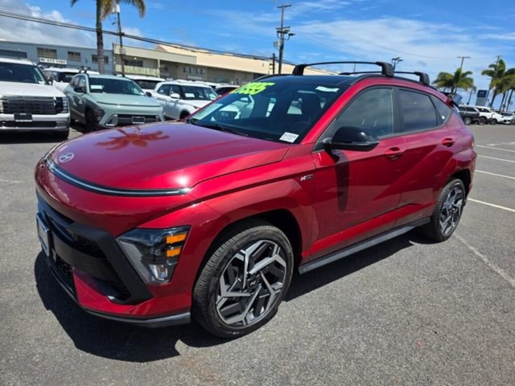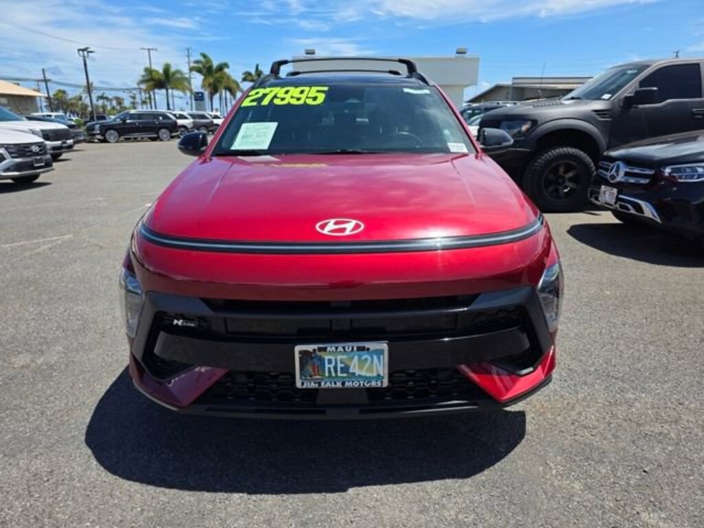 This Hyundai Kona has many features and is well equipped including Option Group 01, 3.510 Axle Ratio, 4-Wheel Disc Brakes, 8 Speakers, ABS brakes, Air Conditioning, Alloy wheels, AM/FM radio: SiriusXM, Apple CarPlay & Android Auto, Auto High-beam Headlights, Auto-dimming Rear-View mirror, Automatic temperature control, Brake assist, Bumpers: body-color, Cargo Net, Cargo Tray, Carpeted Floor Mats, Column-Mounted Shift-By-Wire, Delay-off headlights, Driver door bin, Driver vanity mirror, Dual front impact airbags, Dual front side impact airbags, Electronic Stability Control, Emergency communication system: Bluelink+, Exterior Parking Camera Rear, First Aid Kit, Four wheel independent suspension, Front anti-roll bar, Front Bucket Seats, Front Center Armrest, Front dual zone A/C, Front reading lights, Fully automatic headlights, Heated door mirrors, Heated front seats, Heated Front Sport Bucket Seats, Illuminated entry, Leather Shift Knob, Leather steering wheel, Low tire pressure warning, N-Line Alcantara Sport Combination Seat Trim, Navigation System, Occupant sensing airbag, Outside temperature display, Overhead airbag, Panic alarm, Passenger door bin, Passenger vanity mirror, Power door mirrors, Power driver seat, Power moonroof, Power steering, Power windows, Radio: AM/FM/HD Radio/SiriusXM Audio System, Rear anti-roll bar, Rear Bumper Applique, Rear seat center armrest, Rear window defroster, Rear window wiper, Remote keyless entry, Security system, Speed control, Speed-sensing steering, Split folding rear seat, Spoiler, Steering wheel mounted audio controls, Tachometer, Telescoping steering wheel, Tilt steering wheel, Traction control, Trip computer, Turn signal indicator mirrors, Variably intermittent wipers, and Wheels: 19 x 7.5J Metallic Alloy. Ultimate Red Metallic 2024 Hyundai Kona N Line AWD 8-Speed Automatic I4