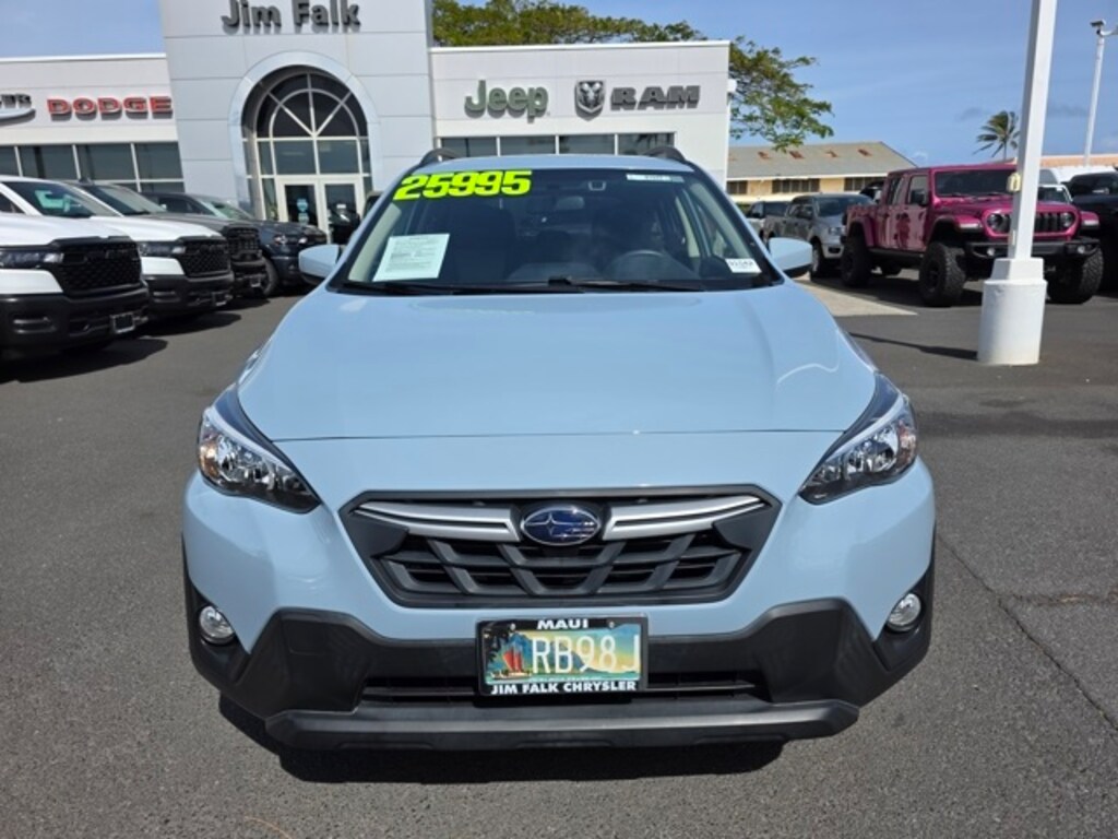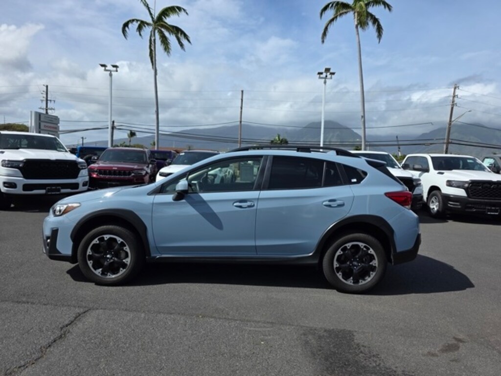This Subaru Crosstrek has many features and is well equipped including 3.90 Axle Ratio, 4-Wheel Disc Brakes, 6 Speakers, ABS brakes, Air Conditioning, Alloy wheels, AM/FM radio: SiriusXM, Anti-whiplash front head restraints, Automatic temperature control, Brake assist, Bumpers: body-color, CD player, Cloth Upholstery, Driver door bin, Driver vanity mirror, Dual front impact airbags, Dual front side impact airbags, Electronic Stability Control, Emergency communication system: STARLINK Safety and Security (Subscription Required), Exterior Parking Camera Rear, Four wheel independent suspension, Front anti-roll bar, Front Bucket Seats, Front Center Armrest, Front fog lights, Front reading lights, Fully automatic headlights, Heated door mirrors, Heated Front Bucket Seats, Heated front seats, Illuminated entry, Knee airbag, Leather Shift Knob, Low tire pressure warning, Occupant sensing airbag, Outside temperature display, Overhead airbag, Overhead console, Panic alarm, Passenger door bin, Passenger vanity mirror, Power door mirrors, Power steering, Power windows, Radio data system, Radio: Subaru STARLINK 6.5" Multimedia Plus System, Rear anti-roll bar, Rear window defroster, Rear window wiper, Remote keyless entry, Security system, Speed control, Speed-sensing steering, Split folding rear seat, Spoiler, STARLINK/Apple CarPlay/Android Auto, Steering wheel mounted audio controls, Tachometer, Telescoping steering wheel, Tilt steering wheel, Traction control, Trip computer, Variably intermittent wipers, and Wheels: 17" x 7.0J Alum Alloy Blk w/Machine Finish. Lagoon Blue Pearl 2023 Subaru Crosstrek Premium AWD Lineartronic CVT 2.0L 4-Cylinder DOHC 16V